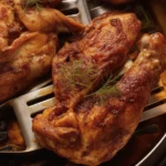Pull the chicken when the thickest part reads 160 to 163°F on a thermometer. Let it rest on the pan for 5 to 7 minutes so carryover heat brings it to 165°F. Melt a small pat of butter over the top while it rests and squeeze a little lemon juice. Slice against the grain.